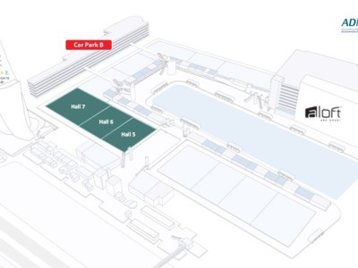 يقع موقف سيارات (E) بالقرب من قاعة أدنيك المارينا ويسهل منه الوصول إلى قاعة المارينا. يقع المدخل مباشرة بعد قاعة المارينا عند شارع الخليج العربي.