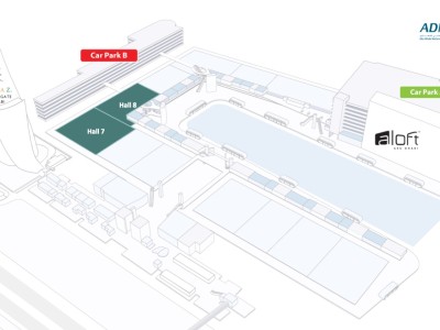 يقع موقف سيارات (E) بالقرب من قاعة أدنيك المارينا ويسهل منه الوصول إلى قاعة المارينا. يقع المدخل مباشرة بعد قاعة المارينا عند شارع الخليج العربي.