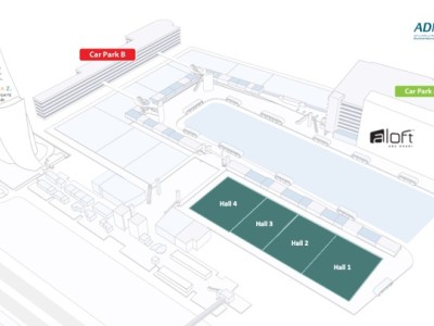 يقع موقف سيارات (E) بالقرب من قاعة أدنيك المارينا ويسهل منه الوصول إلى قاعة المارينا. يقع المدخل مباشرة بعد قاعة المارينا عند شارع الخليج العربي.