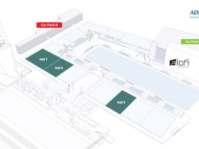 يقع موقف سيارات (E) بالقرب من قاعة أدنيك المارينا ويسهل منه الوصول إلى قاعة المارينا. يقع المدخل مباشرة بعد قاعة المارينا عند شارع الخليج العربي.