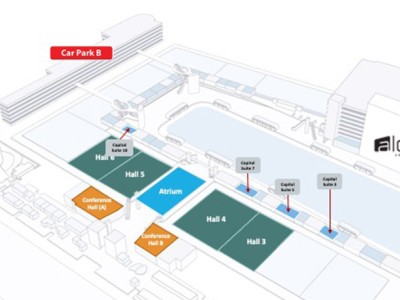 يقع موقف سيارات (E) بالقرب من قاعة أدنيك المارينا ويسهل منه الوصول إلى قاعة المارينا. يقع المدخل مباشرة بعد قاعة المارينا عند شارع الخليج العربي.